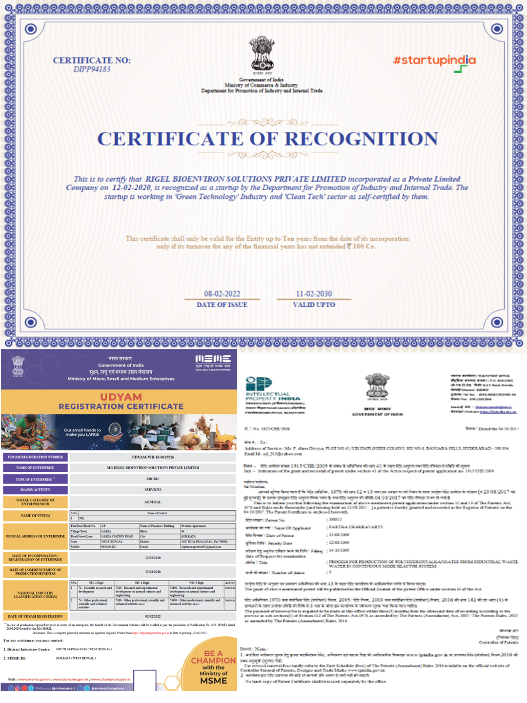- Recognised by Department of Promotion of Industry and Internal Trade (DPII) for working on ‘Green technology’ industry and ‘Clean tech’ sector. Valid upto 11.2.2030